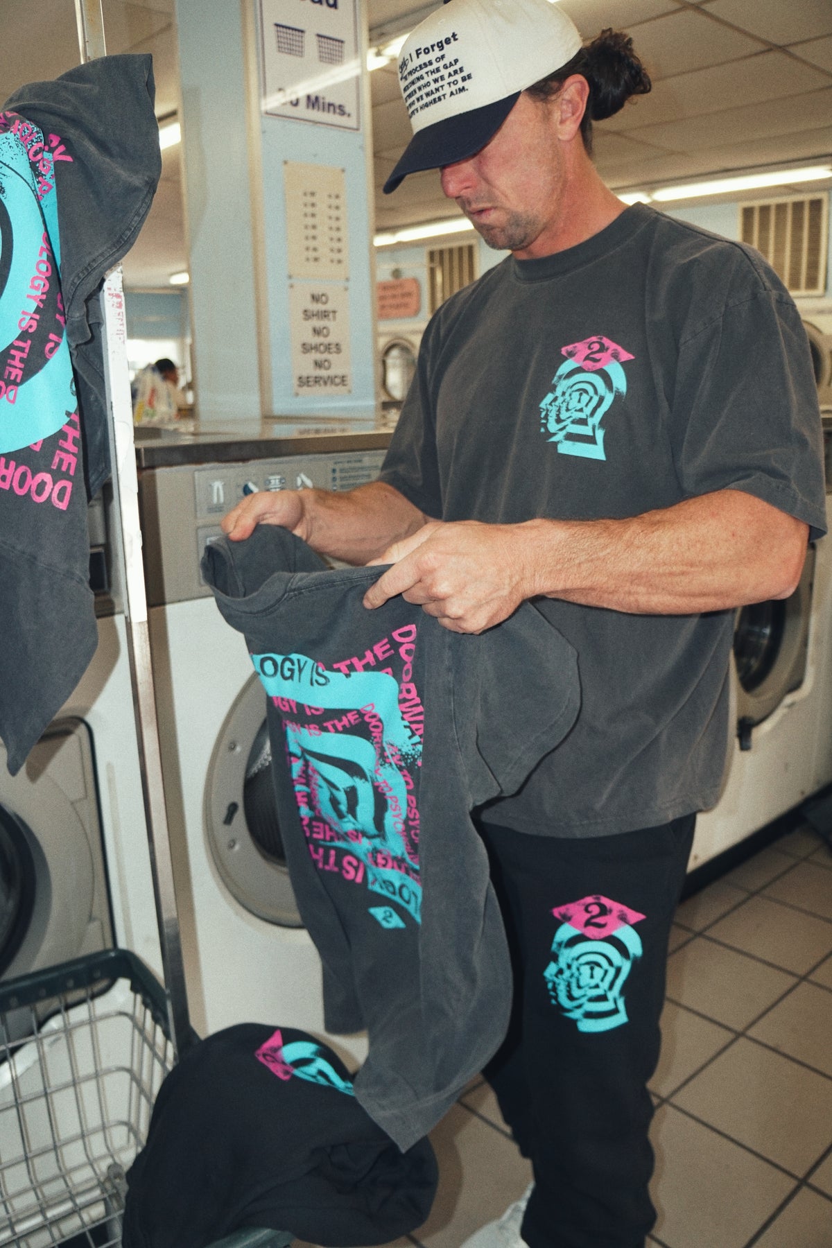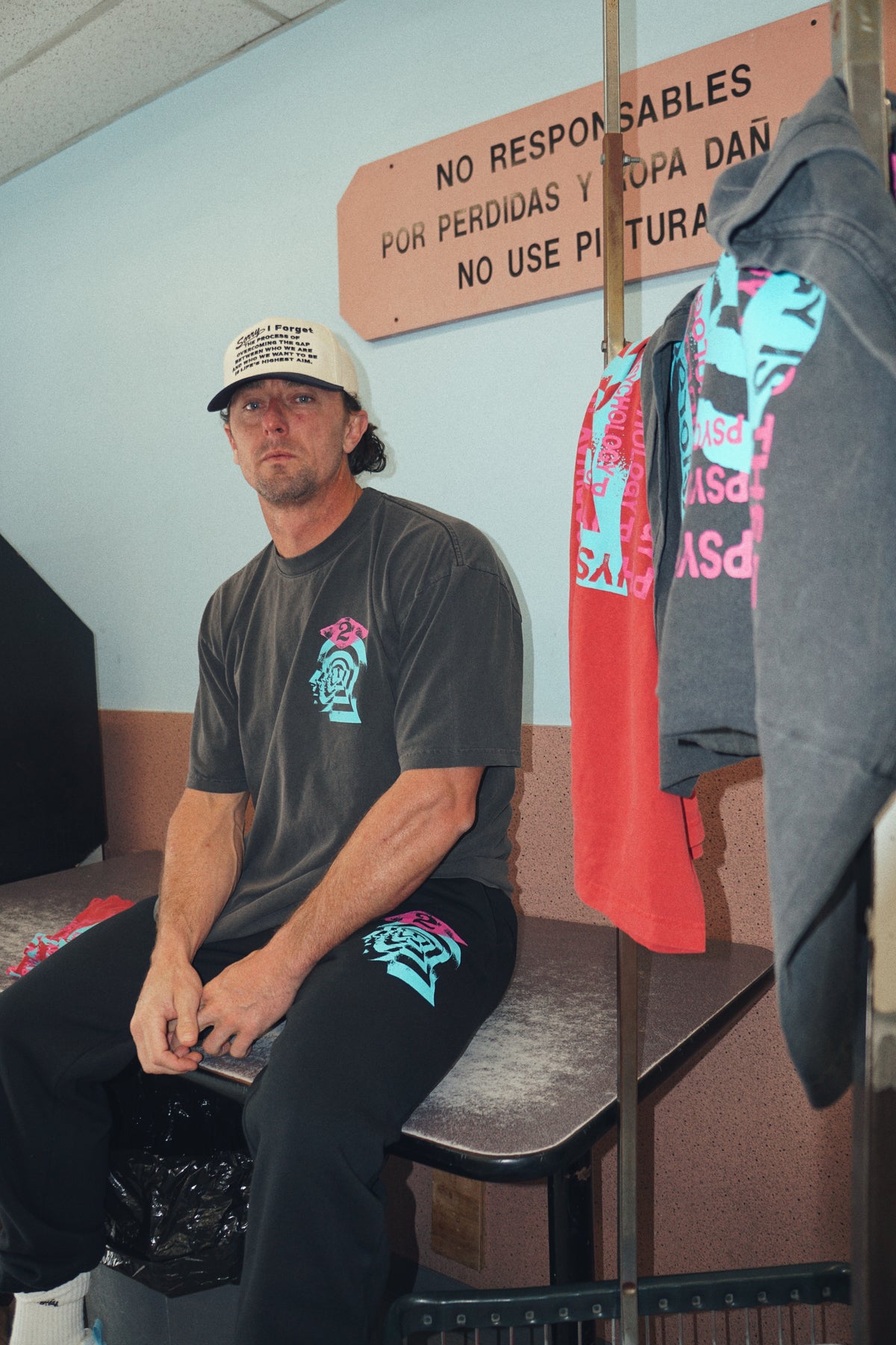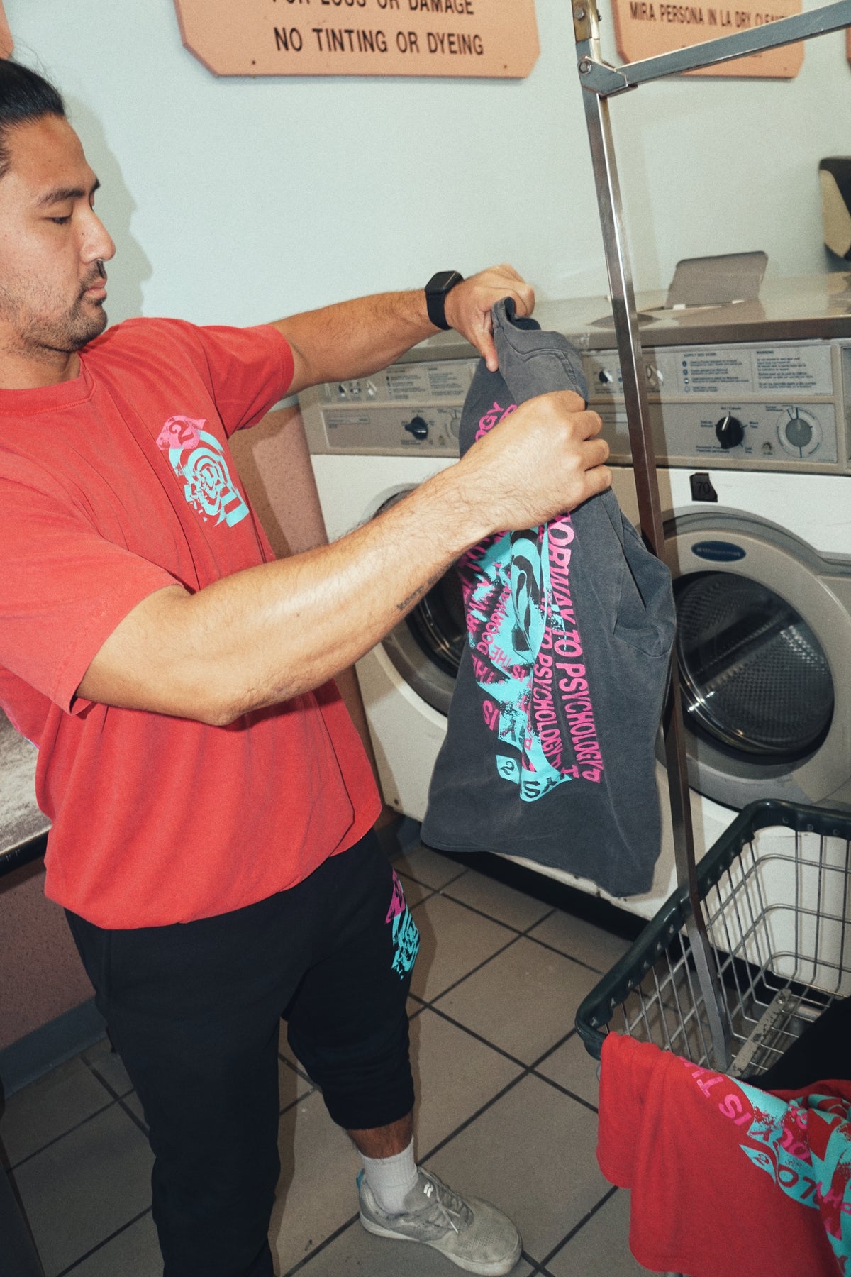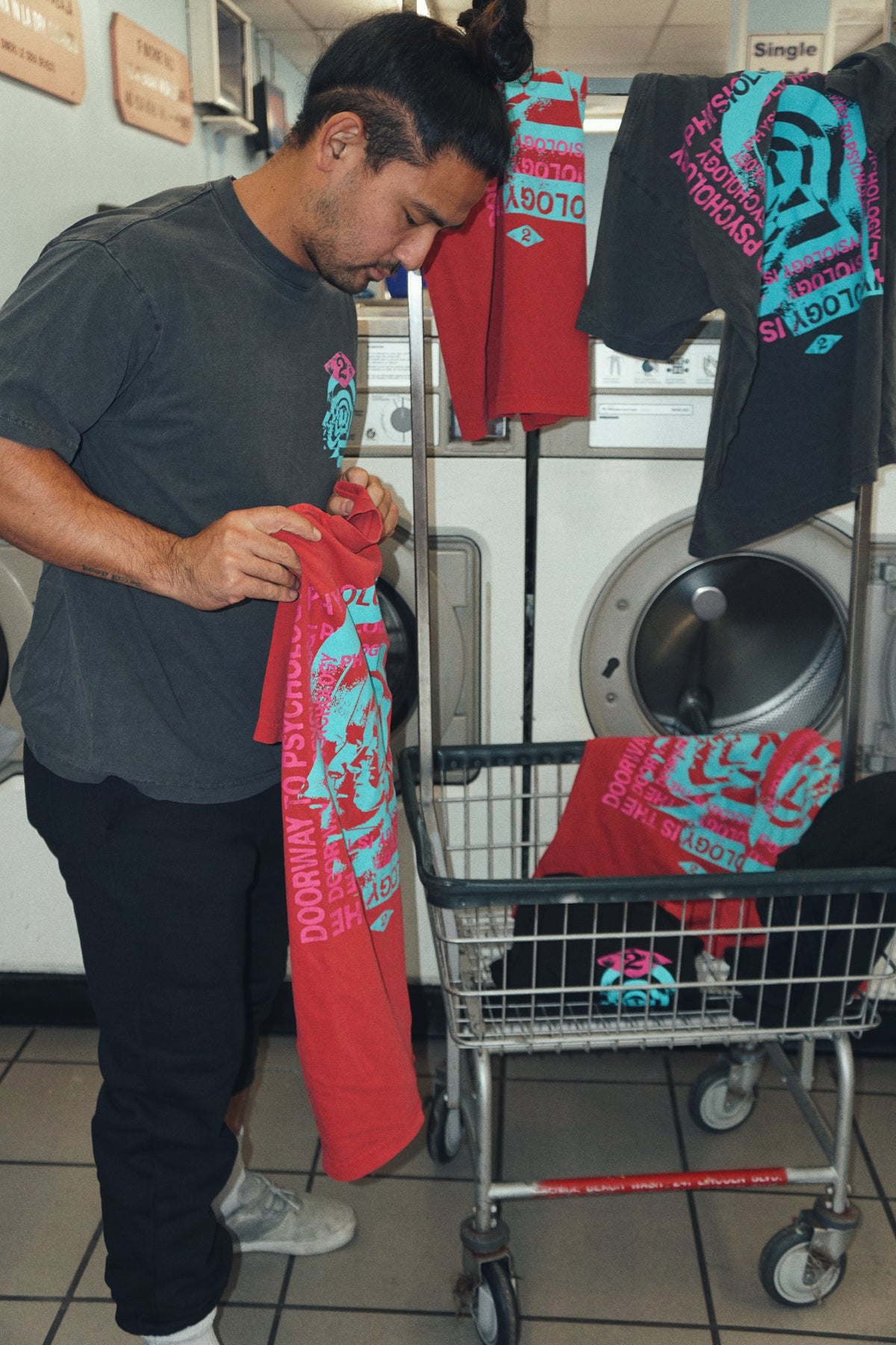 This tee comes in vintage red and vintage black pigment and is printed on custom 50% recycles ECOCYCLE tees here in Los Angeles.